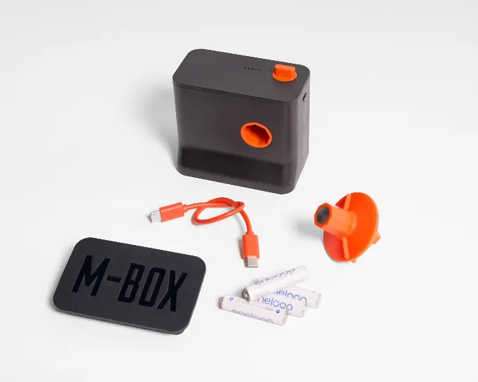- To charge the M-BOX, insert the supplied USB-C cable into the port on the side of the motor.